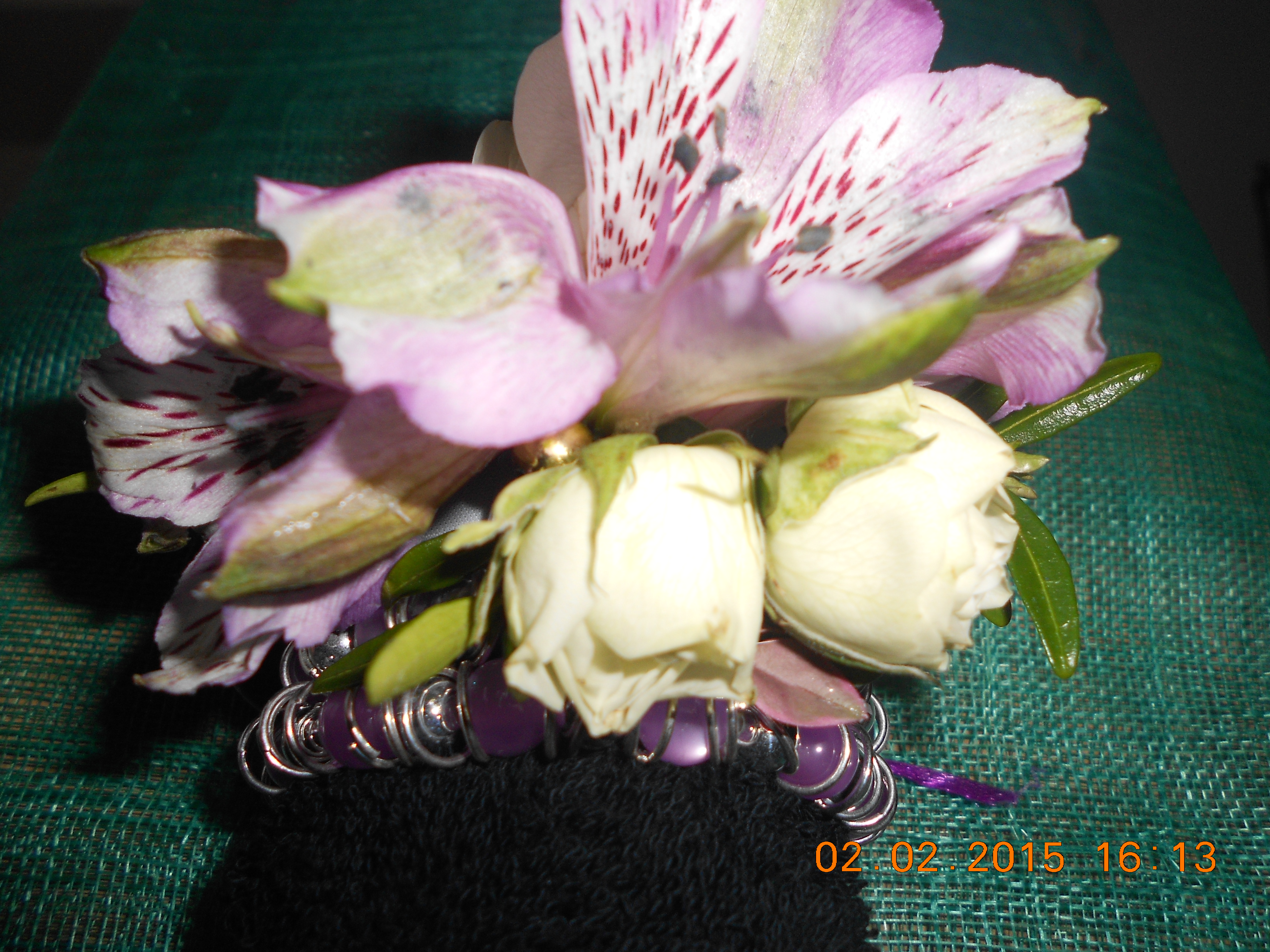 Rosebuds and Alstromeria which hug your wrist  . Both available in the right colour to complement your dress.